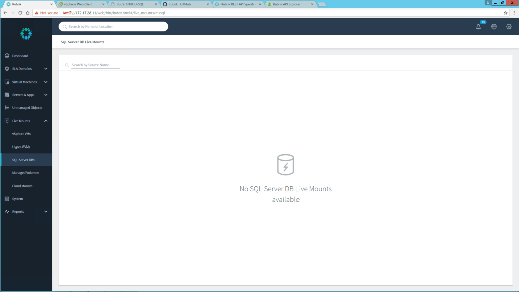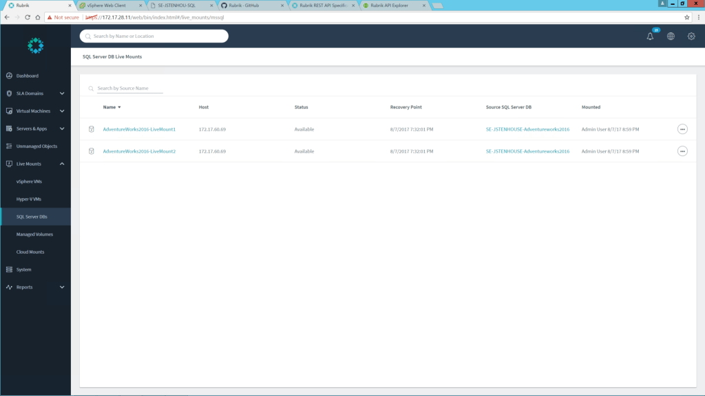 A quick trip to the Rubrik GUI and my SQL server confirms the live mounts have gone: