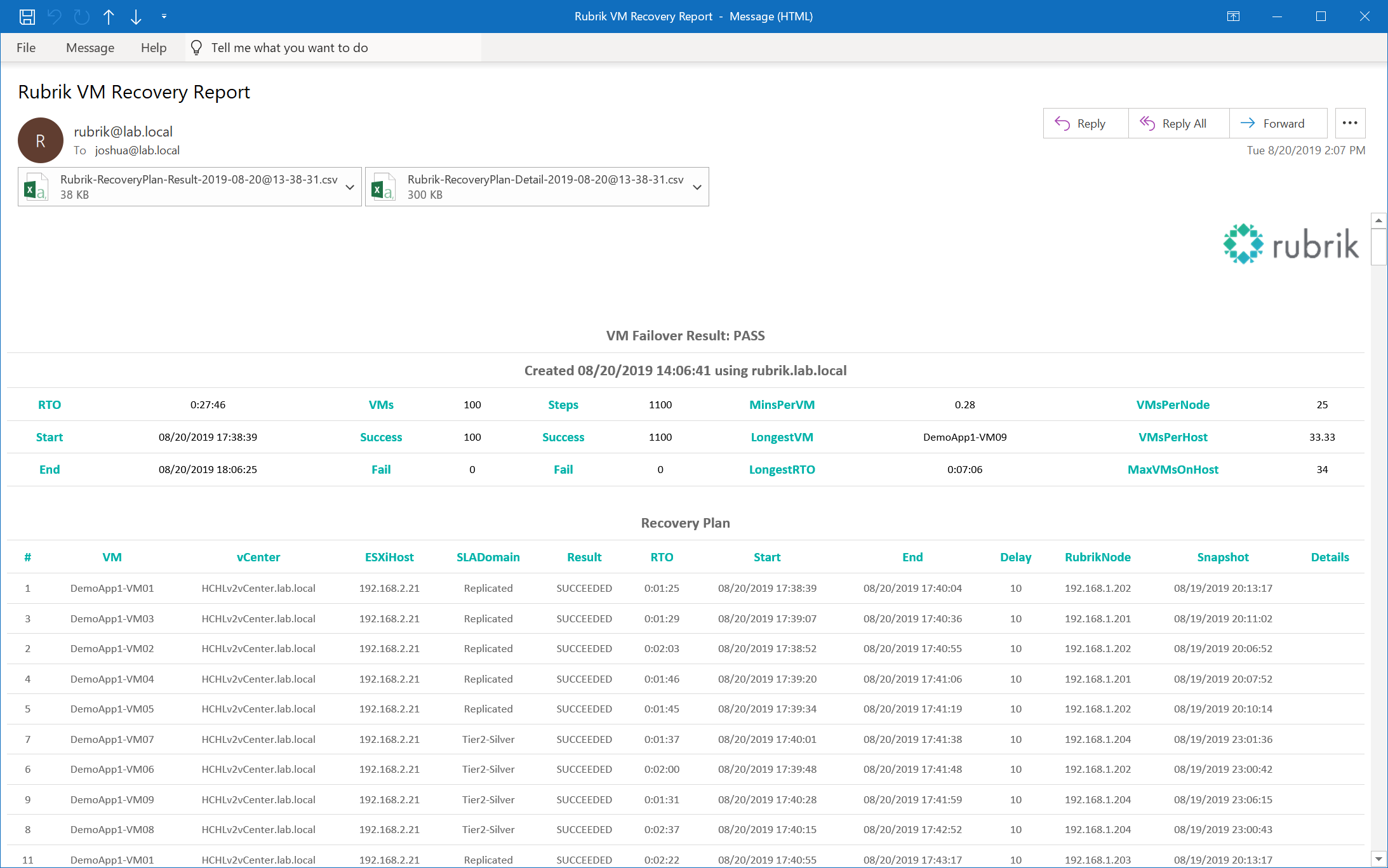 You can also configure $LogoFile to customize the email reports with your own company logo. Here’s the result of me recovering 100 Windows 2016 VMs using a 4-node r344 Rubrik cluster to my 3 ESXi host HyperConverged Home Lab 2.0: