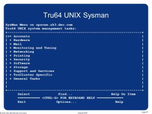 Tru64 UNIX system management tasks: |>+ Accounts | | + Hardware | | + Mail | | + Monitoring and Tuning | | + Networking | | + Printing | | + Security | | + Software | | + Storage | | + Support and Services | | + TruCluster Specific | | +…